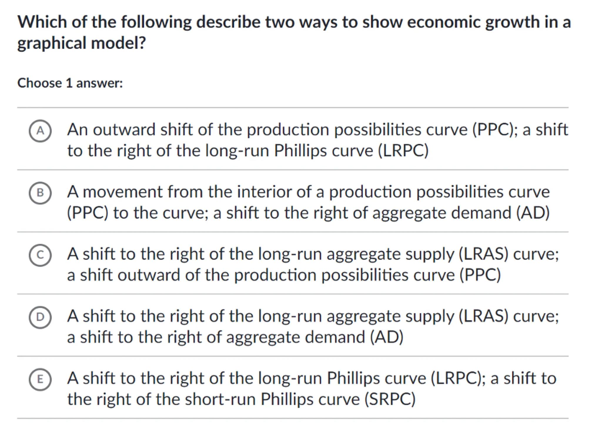 (A) An outward shift of the production possibilities curve (PPC); a shift to the right of the long-run Phillips curve (LRPC)