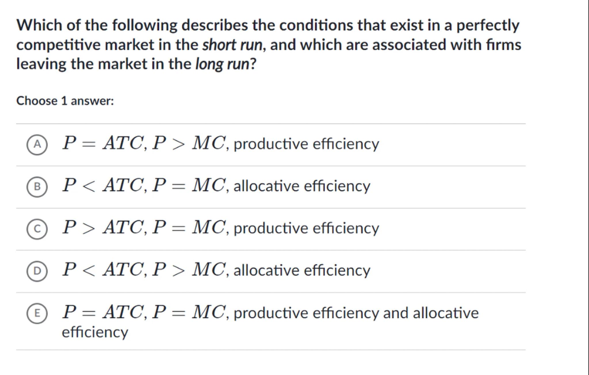 Which of the following describes the conditions that exist in a perfectly competitive market in the short run, and which are associated with firms leaving the market in the long run?