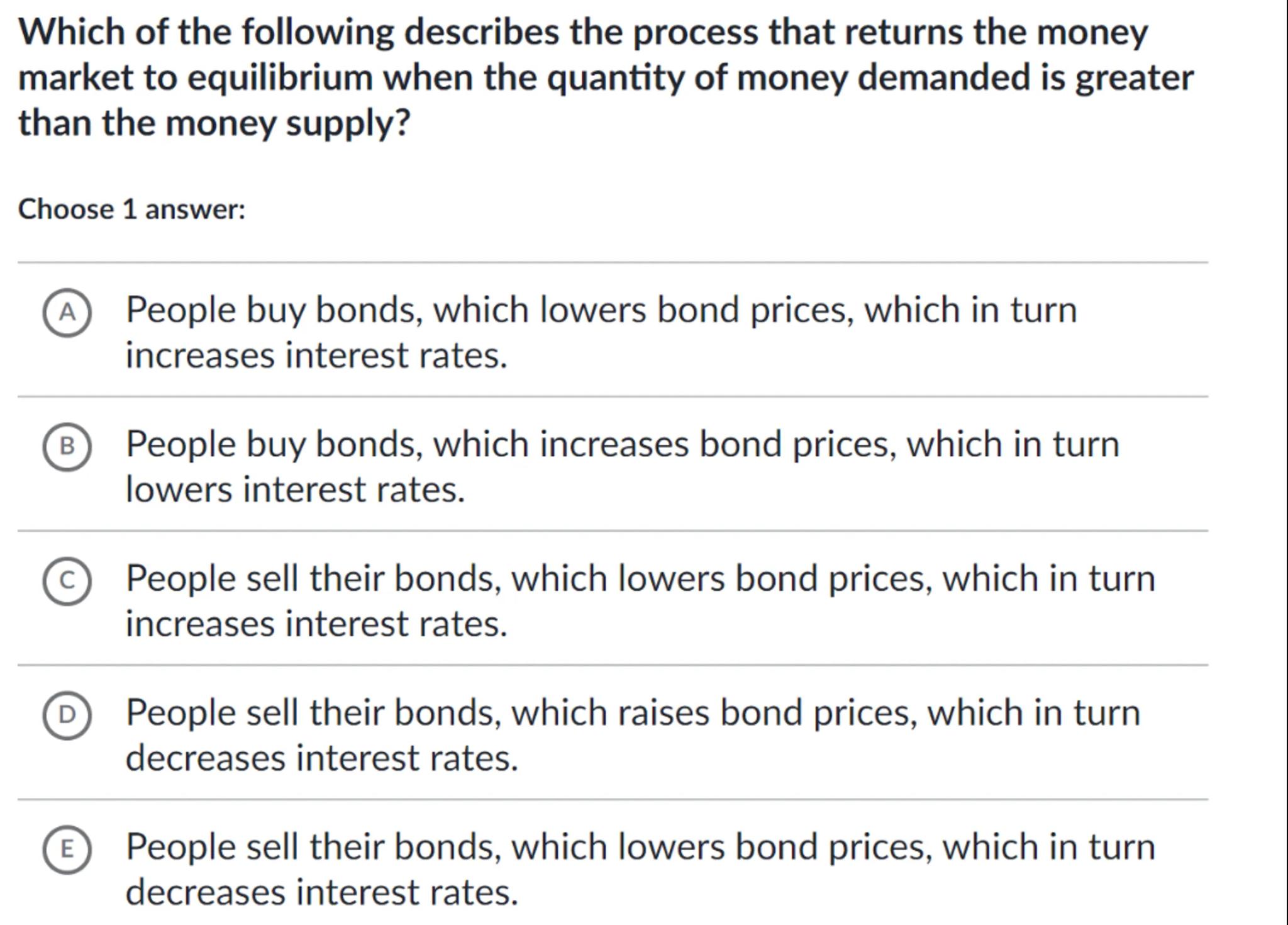 (A) People buy bonds, which lowers bond prices, which in turn increases interest rates.