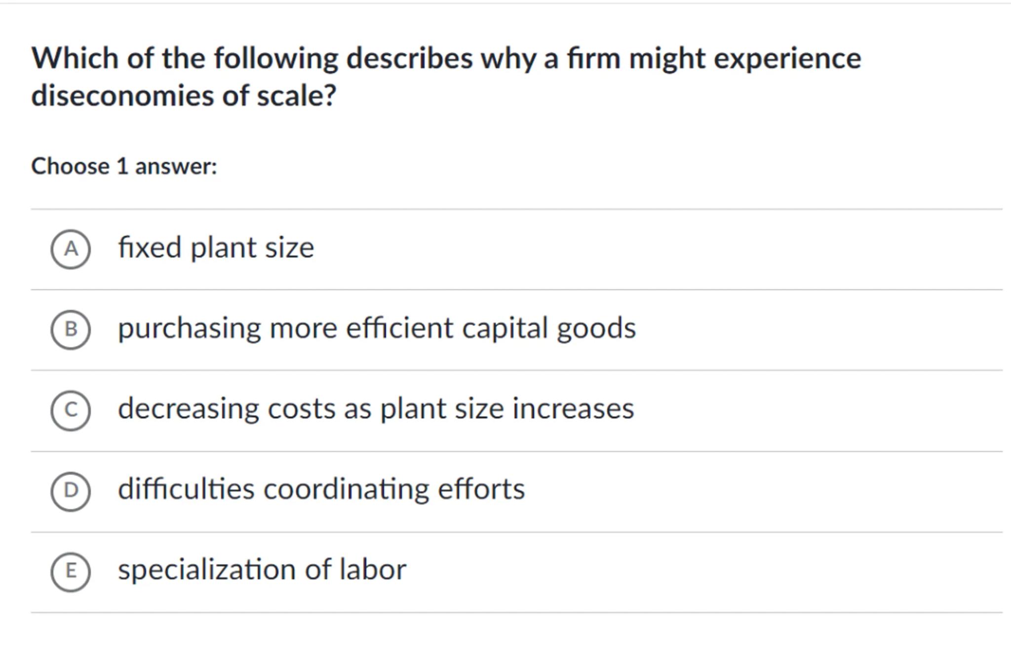 Which of the following describes why a firm might experience diseconomies of scale?