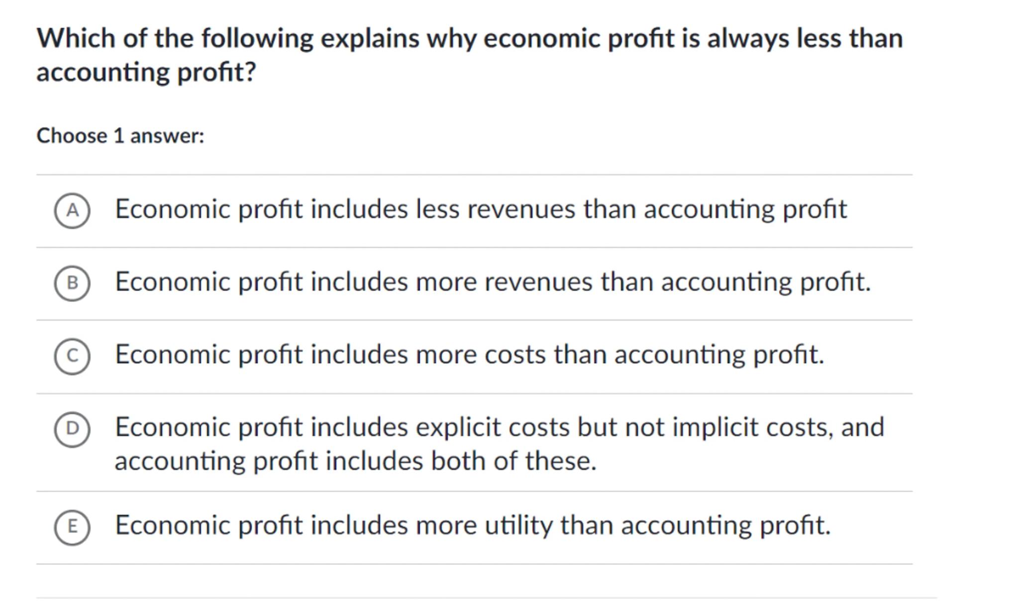 (D) Economic profit includes explicit costs but not implicit costs, and accounting profit includes both of these.