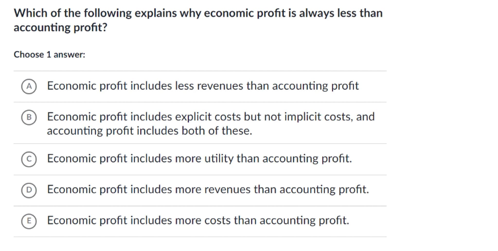 (B) Economic profit includes explicit costs but not implicit costs, and accounting profit includes both of these.
