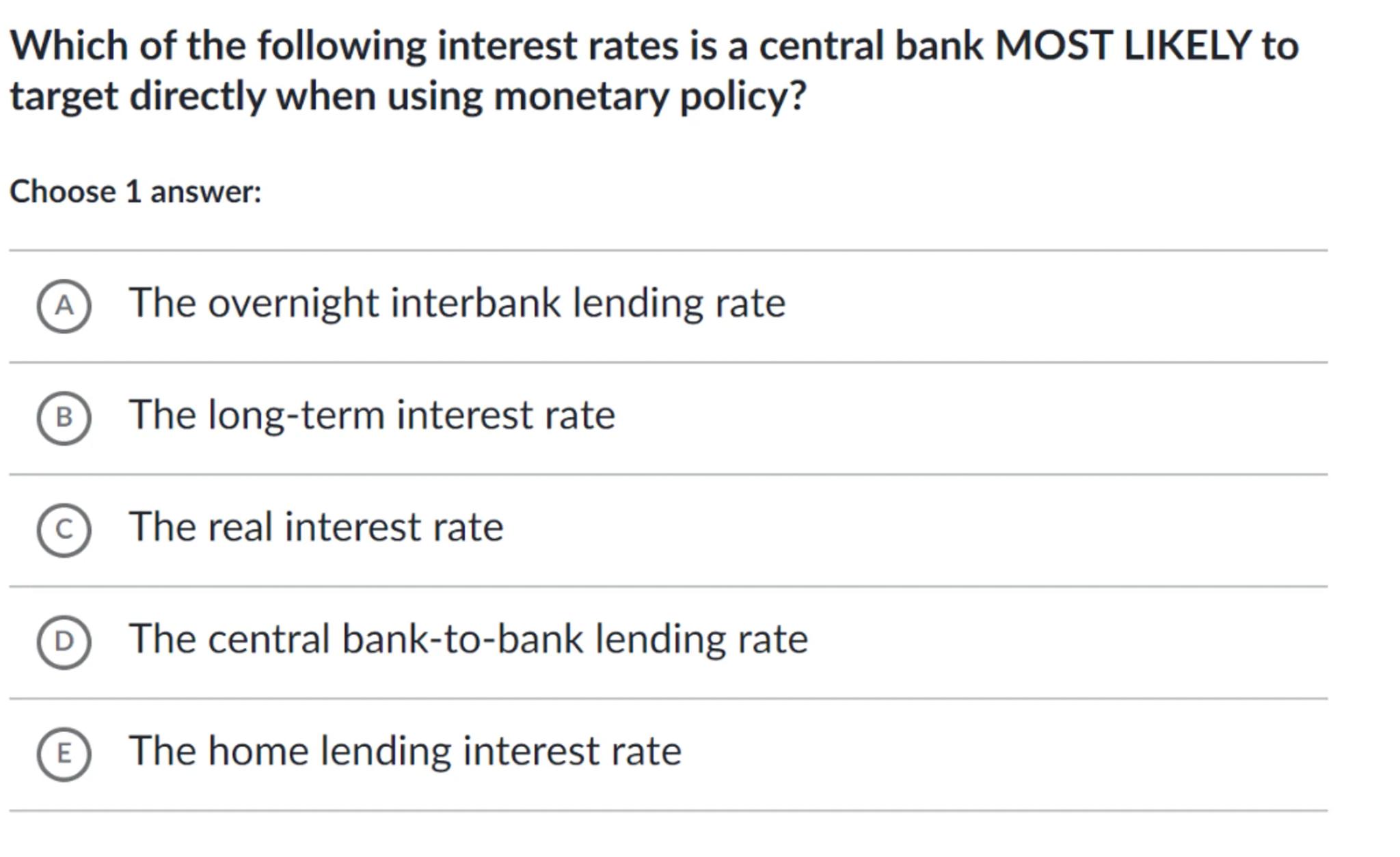 Which of the following interest rates is a central bank MOST LIKELY to target directly when using monetary policy?