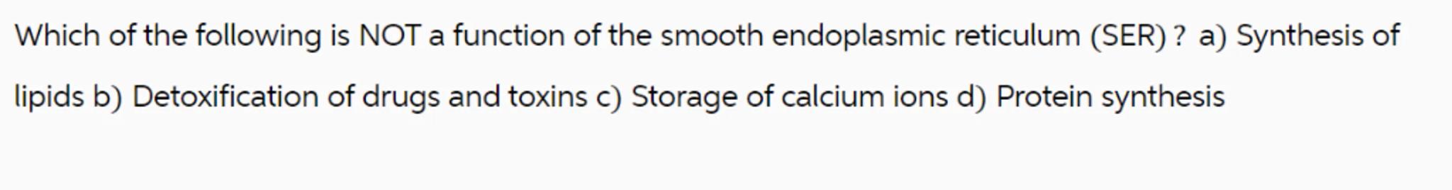 Which of the following is NOT a function of the smooth endoplasmic reticulum (SER)? a) Synthesis of lipids b) Detoxification of drugs and toxins c) Storage of calcium ions d) Protein synthesis