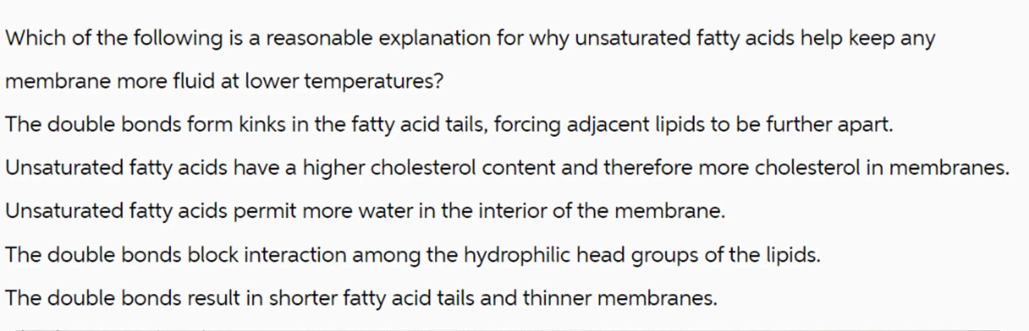 Which of the following is a reasonable explanation for why unsaturated fatty acids help keep any membrane more fluid at lower temperatures?