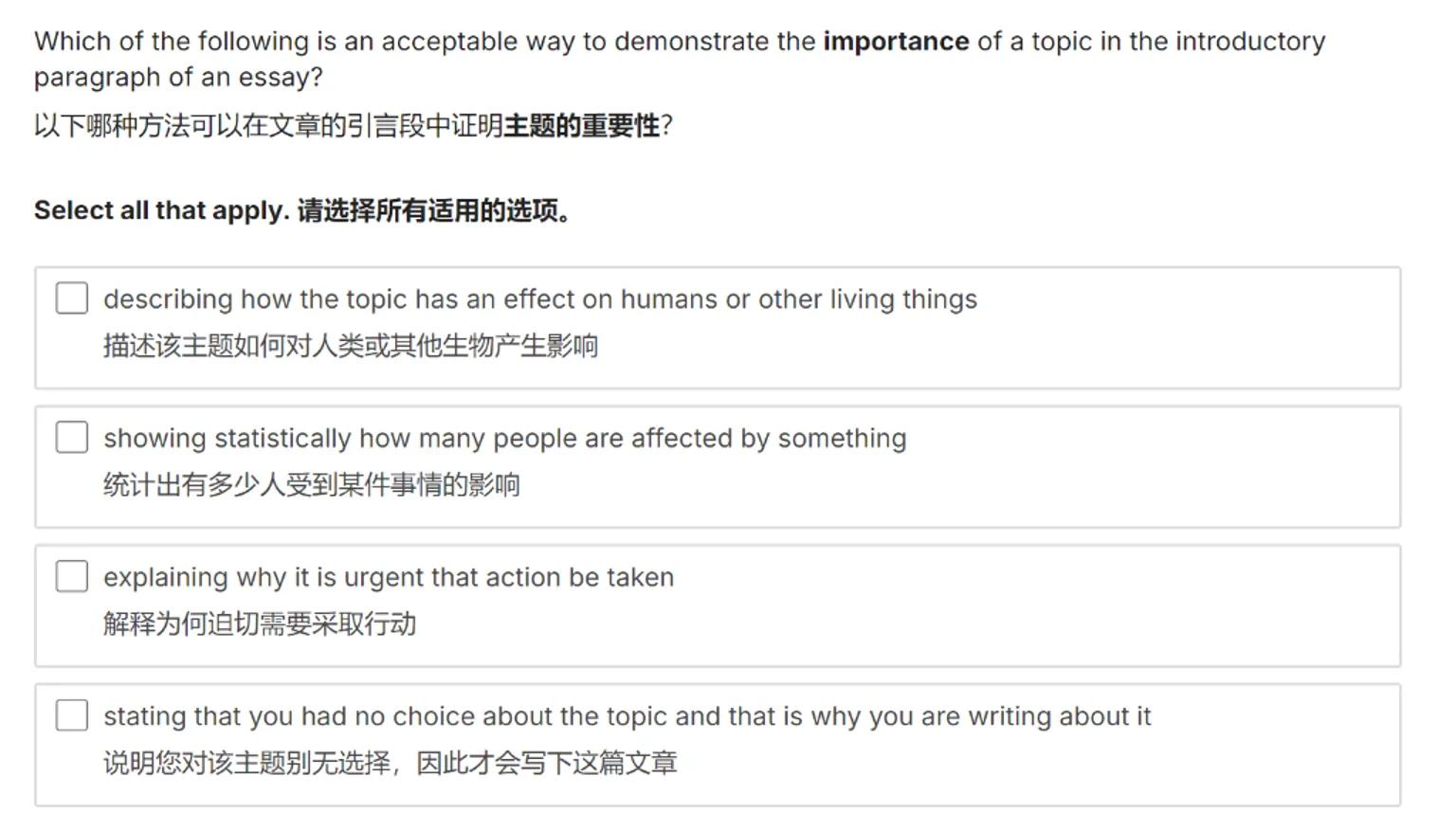 You can select these three options as they all effectively demonstrate the importance of a topic in an essay's introductory paragraph.Not the question you are looking for? Ask here!