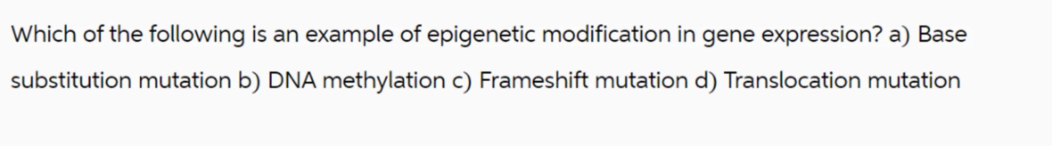 Which of the following is an example of epigenetic modification in gene expression? a) Base substitution mutation b) DNA methylation c) Frameshift mutation d) Translocation mutation