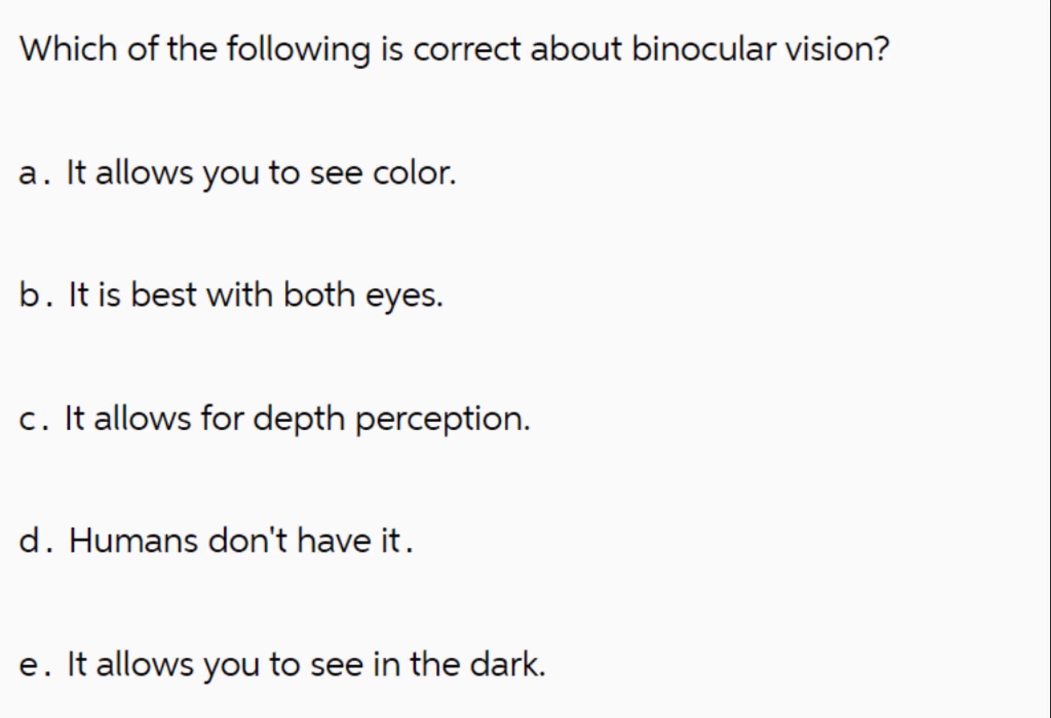 Which of the following is correct about binocular vision?