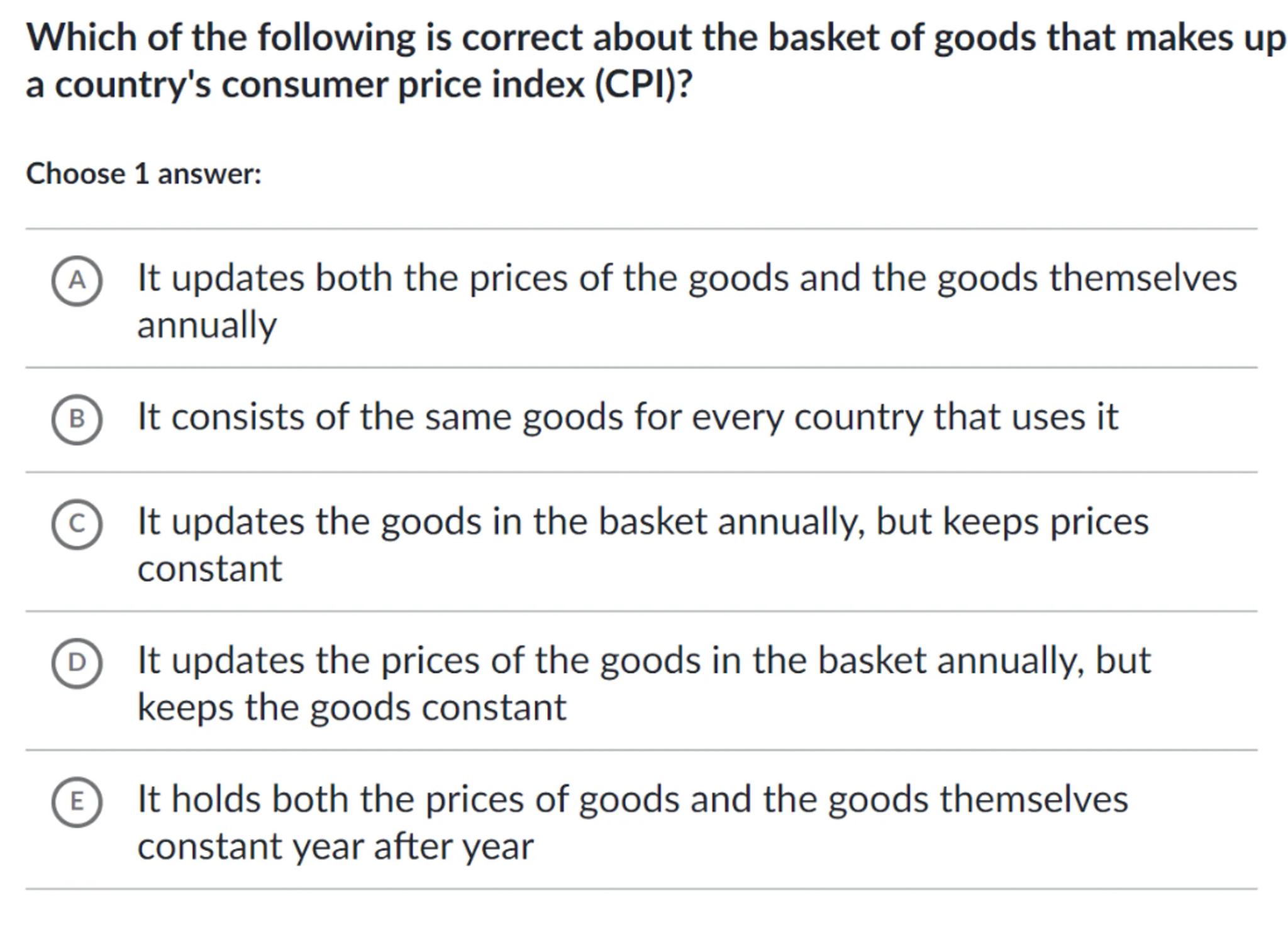 D It updates the prices of the goods in the basket annually, but keeps the goods constant