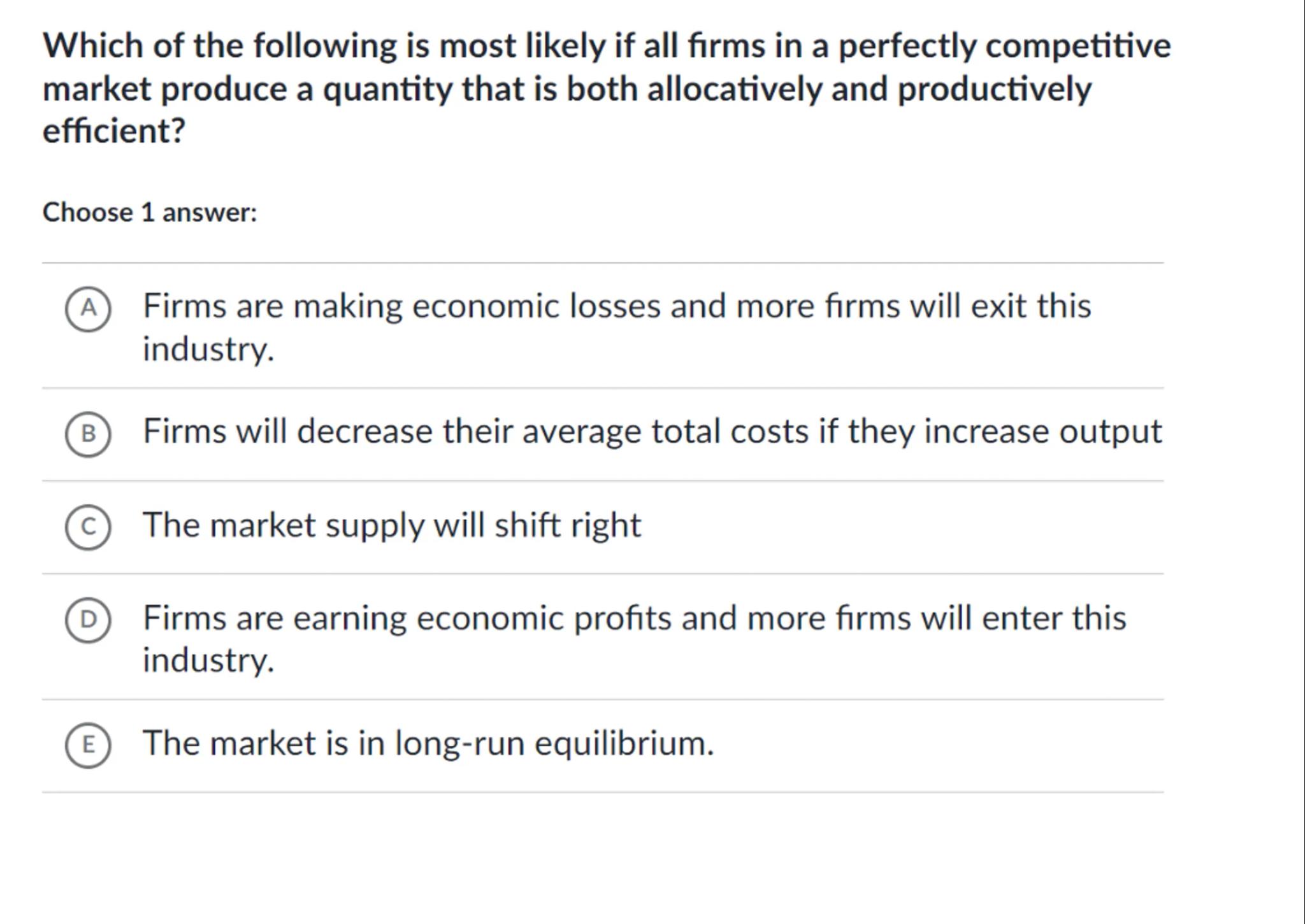 Which of the following is most likely if all firms in a perfectly competitive market produce a quantity that is both allocatively and productively efficient?