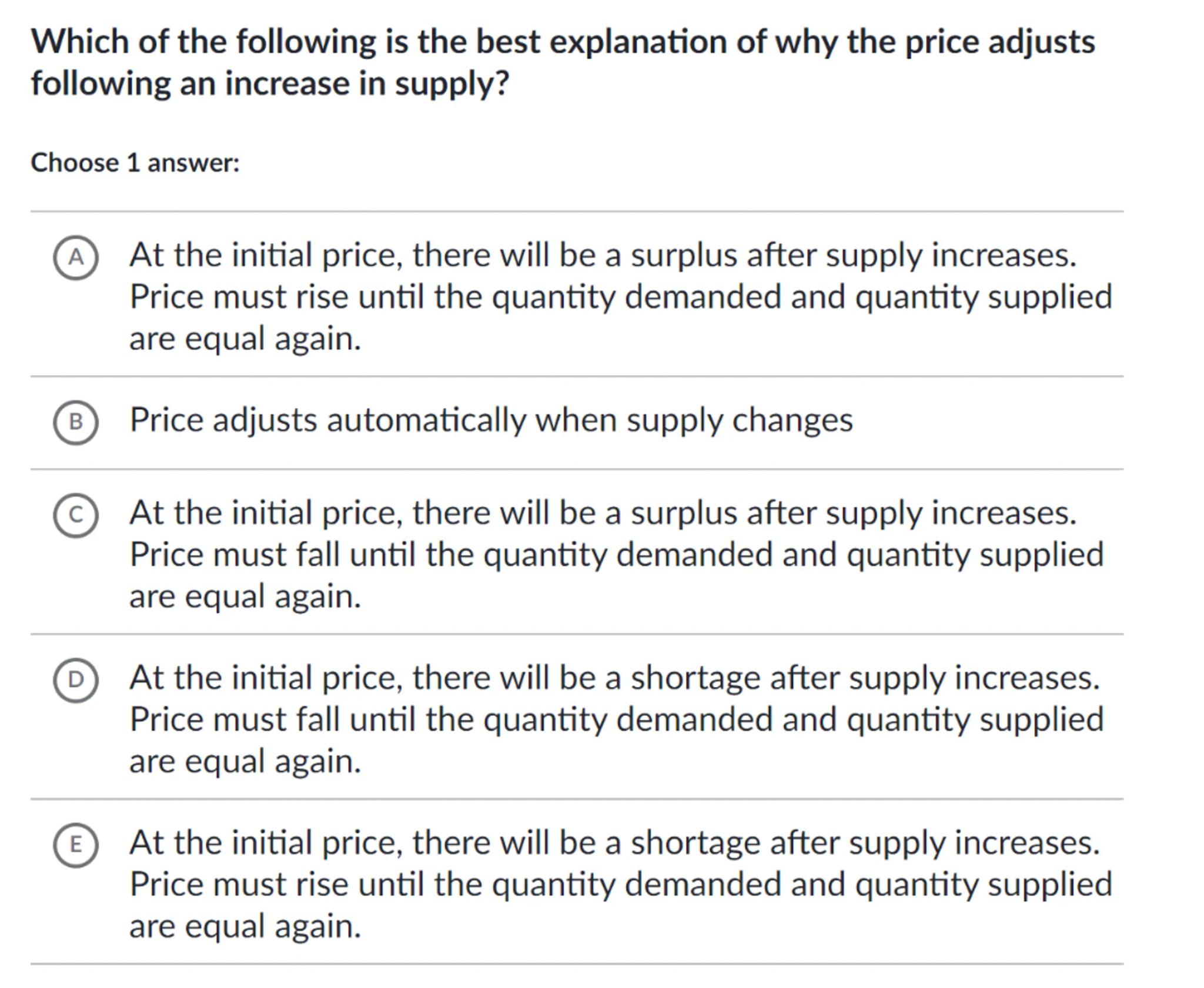Which of the following is the best explanation of why the price adjusts following an increase in supply?