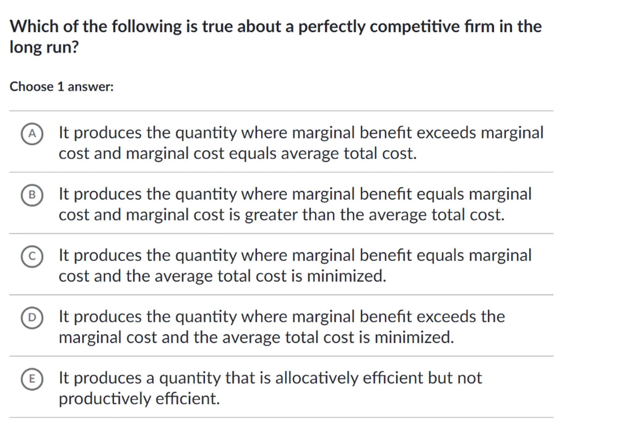 (C) It produces the quantity where marginal benefit equals marginal cost and the average total cost is minimized.
