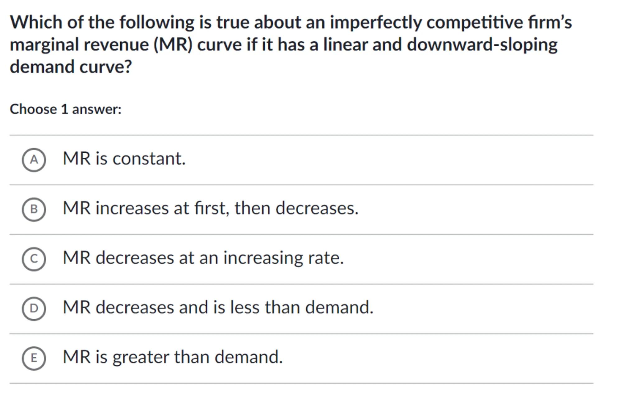 Which of the following is true about an imperfectly competitive firm's marginal revenue (MR) curve if it has a linear and downward-sloping demand curve?