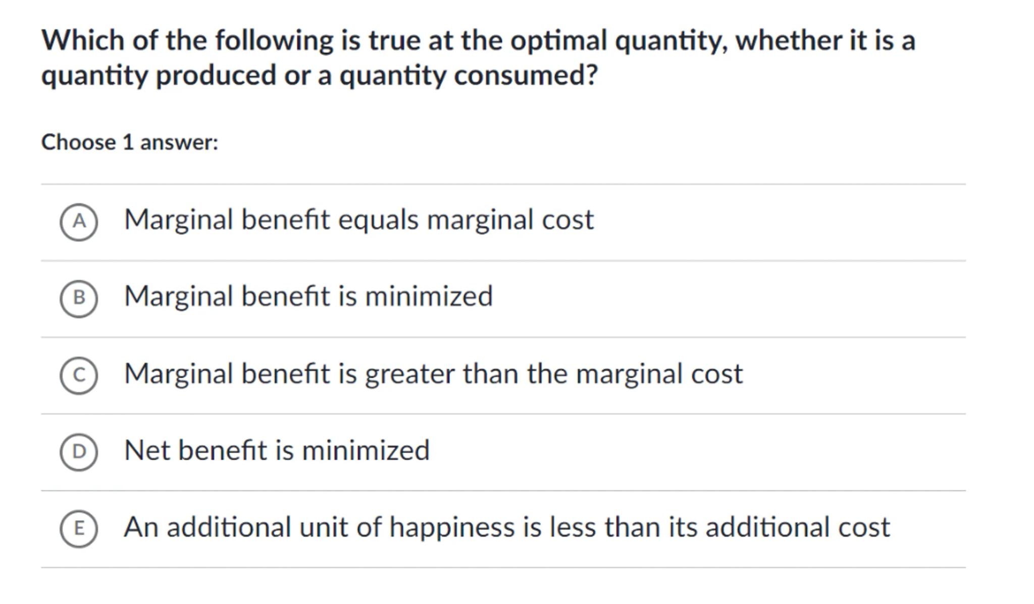 Which of the following is true at the optimal quantity, whether it is a quantity produced or a quantity consumed?