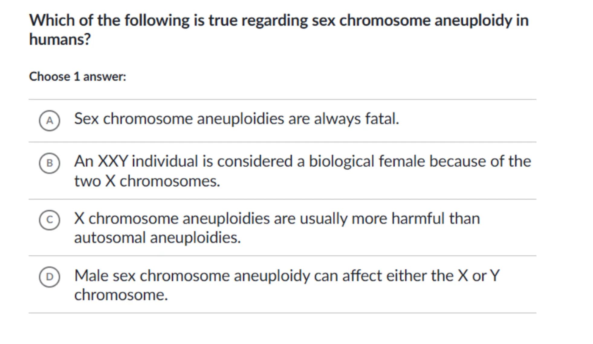 (D) Male sex chromosome aneuploidy can affect either the or chromosome.
