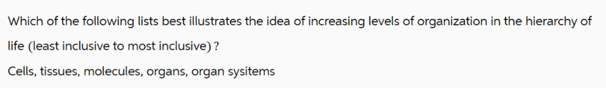 Which of the following lists best illustrates the idea of increasing levels of organization in the hierarchy of life (least inclusive to most inclusive) ?