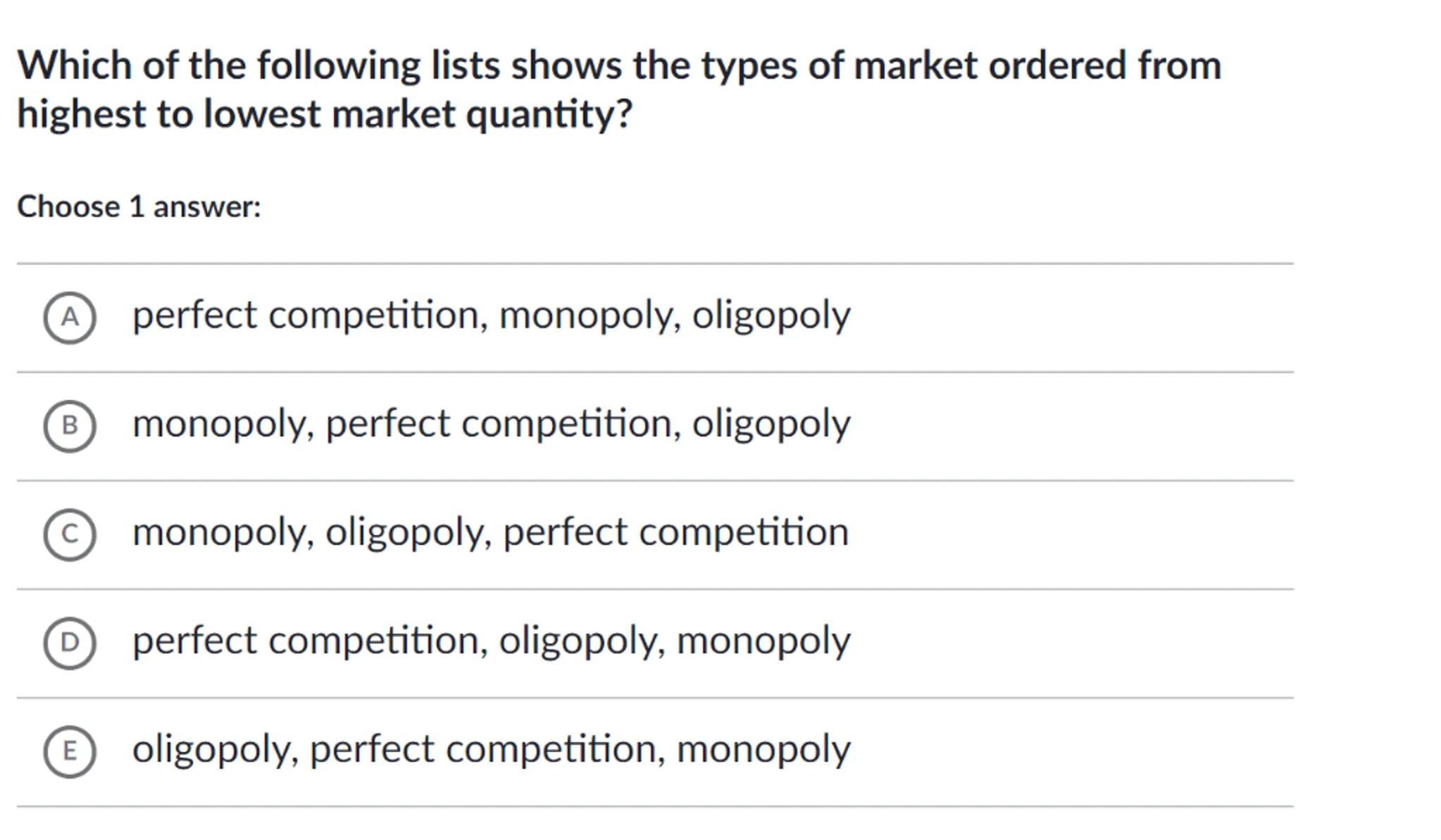 Which of the following lists shows the types of market ordered from highest to lowest market quantity?