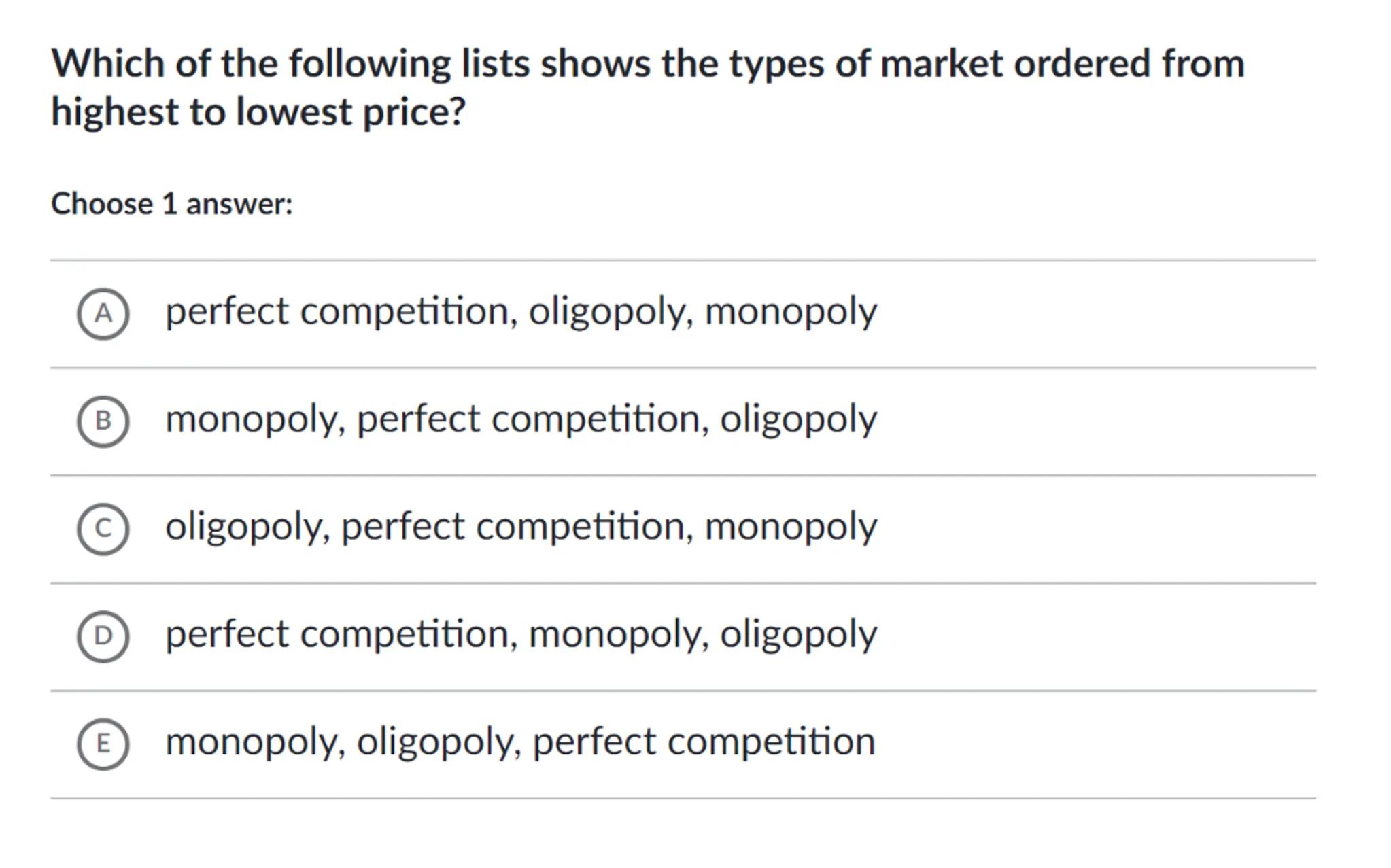 Which of the following lists shows the types of market ordered from highest to lowest price?