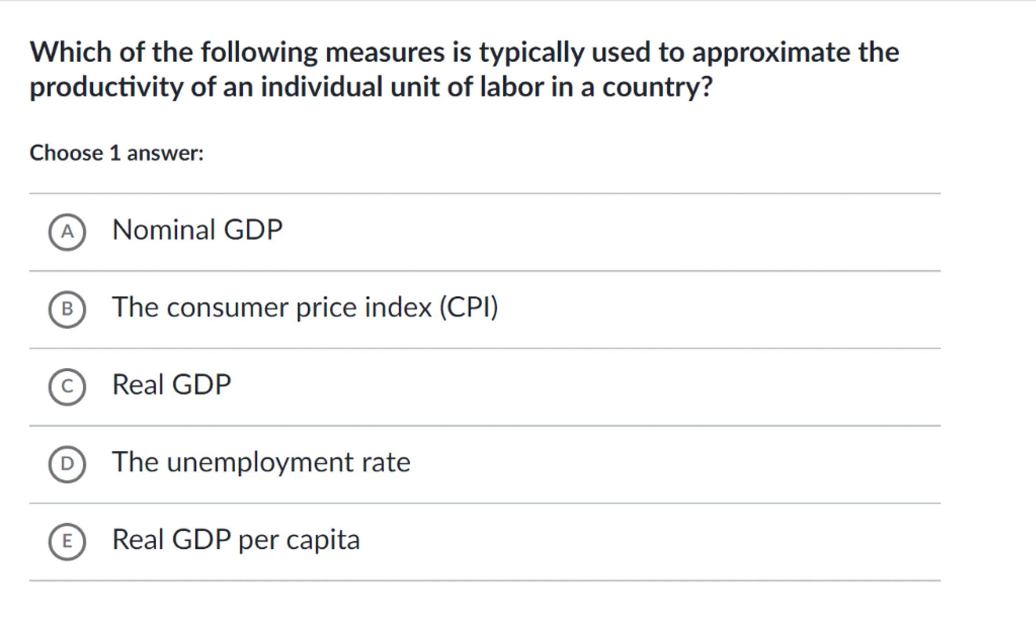 Which of the following measures is typically used to approximate the productivity of an individual unit of labor in a country?