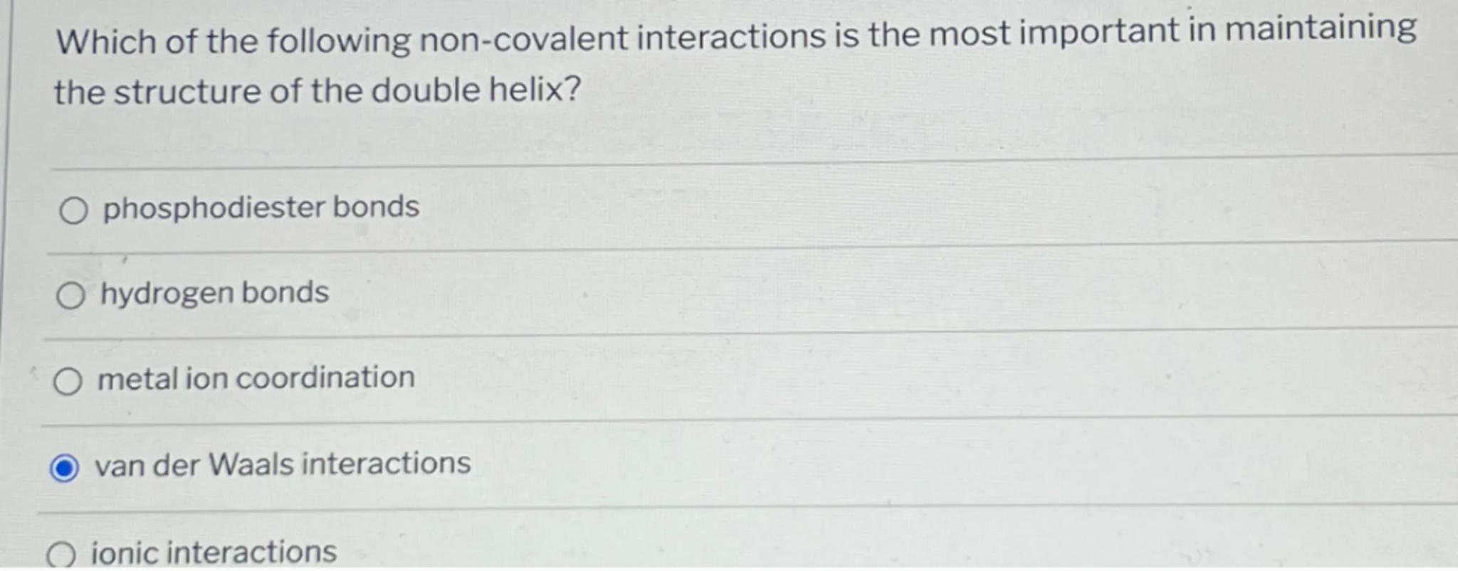Which of the following non-covalent interactions is the most important in maintaining the structure of the double helix?