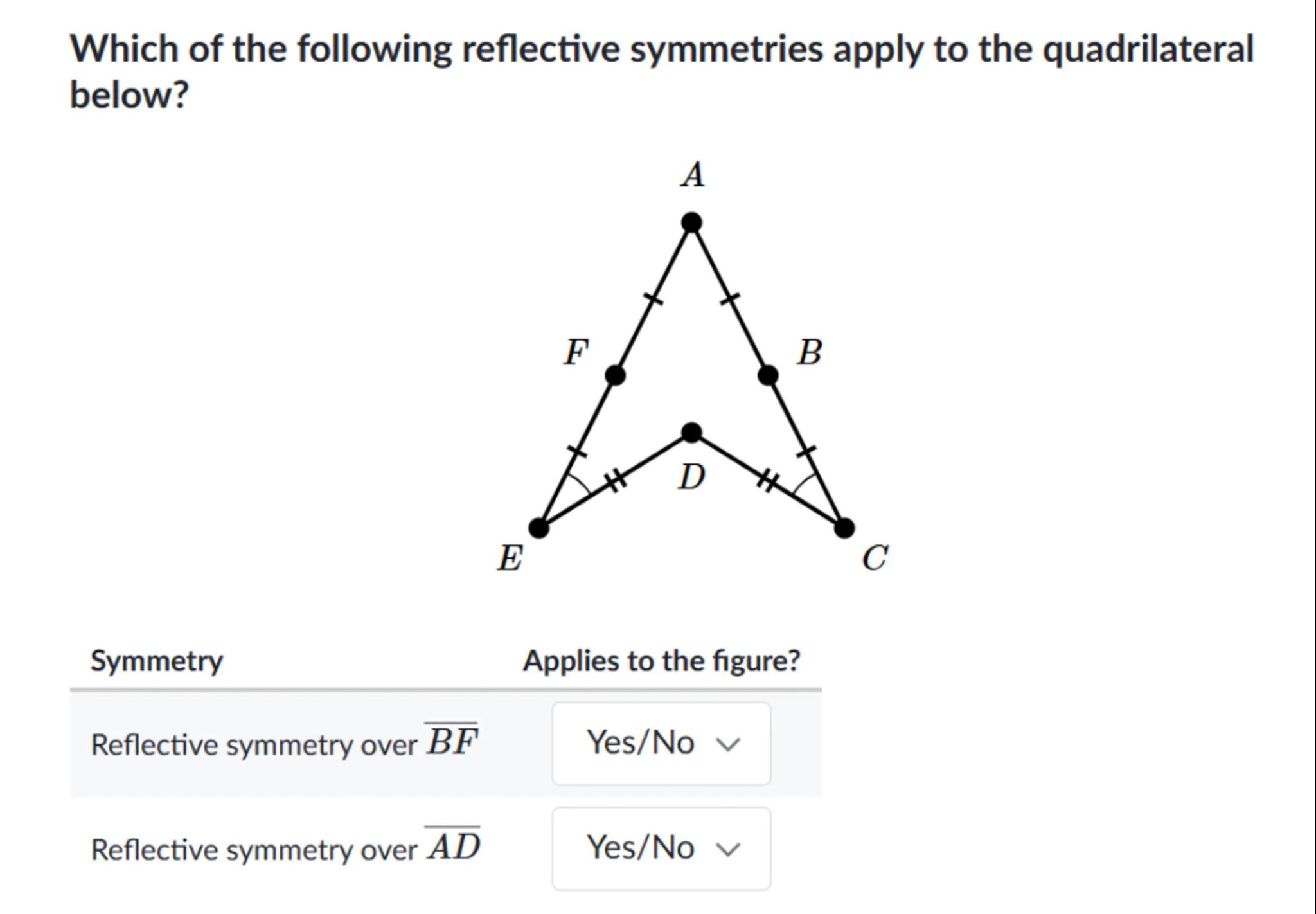 Which of the following reflective symmetries apply to the quadrilateral below?