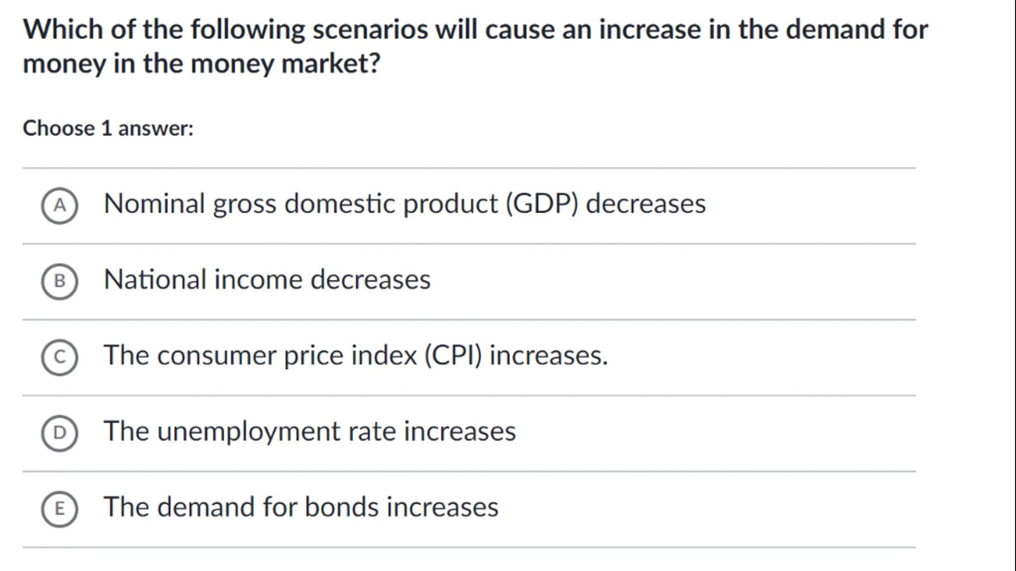 Which of the following scenarios will cause an increase in the demand for money in the money market?