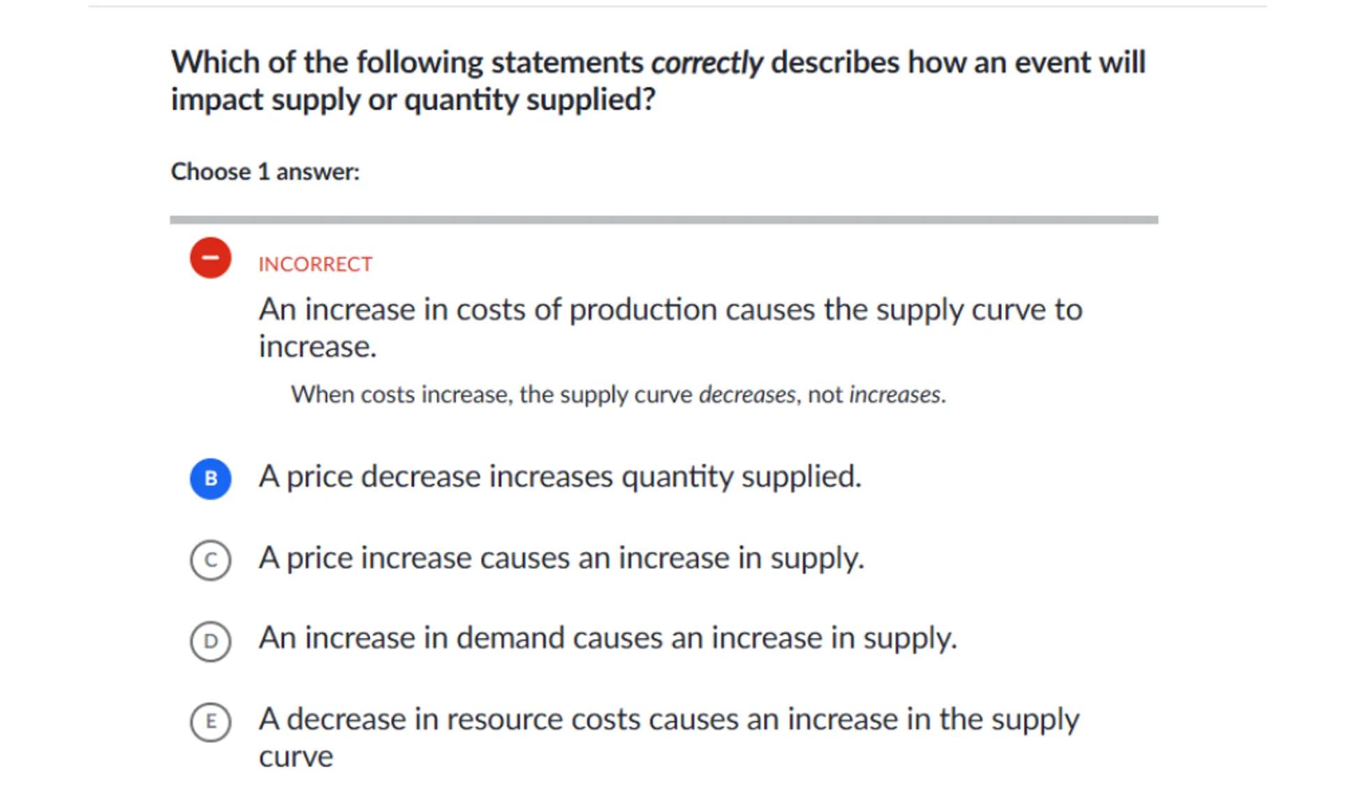 (E) A decrease in resource costs causes an increase in the supply curve