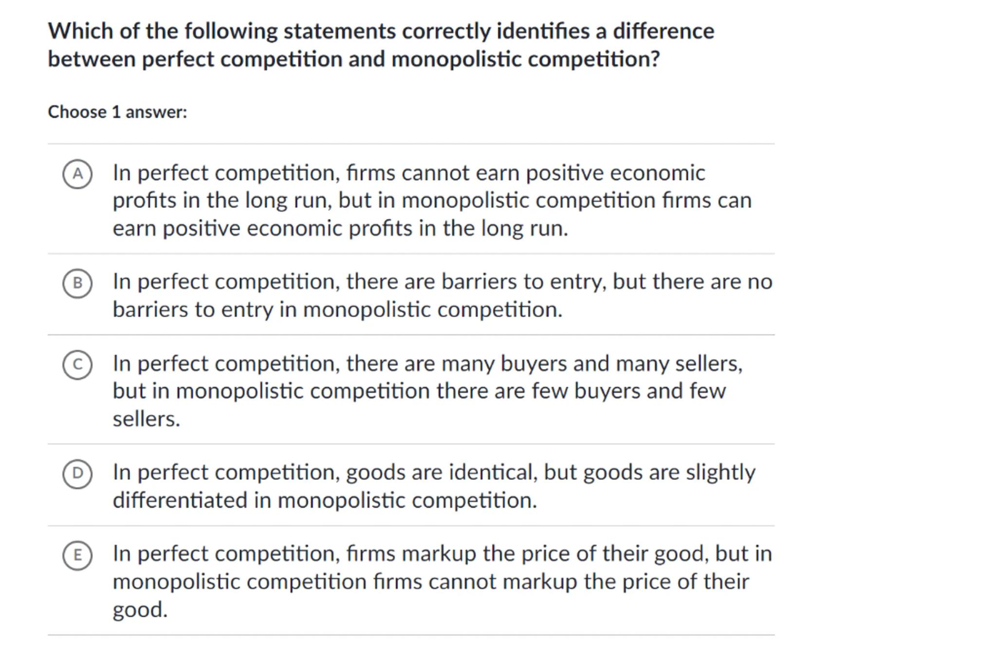 (E) In perfect competition, firms markup the price of their good, but in monopolistic competition firms cannot markup the price of their good.