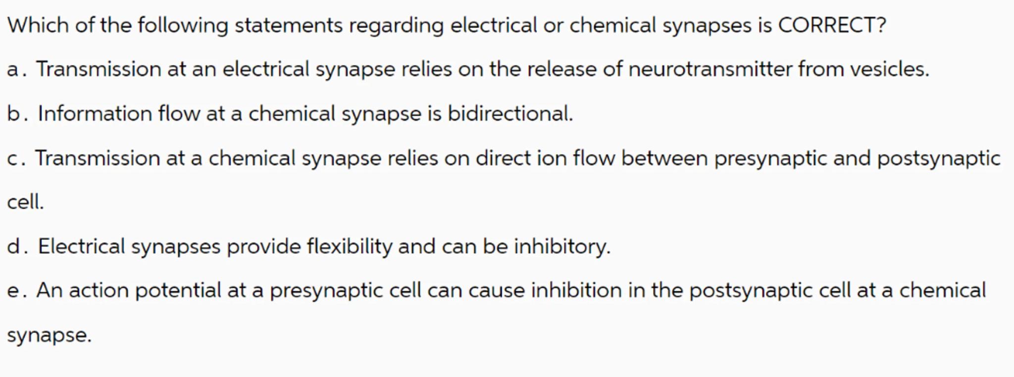 c. Transmission at a chemical synapse relies on direct ion flow between presynaptic and postsynaptic cell.