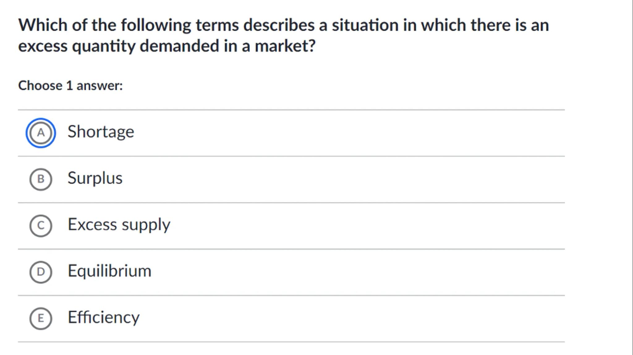 Which of the following terms describes a situation in which there is an excess quantity demanded in a market?
