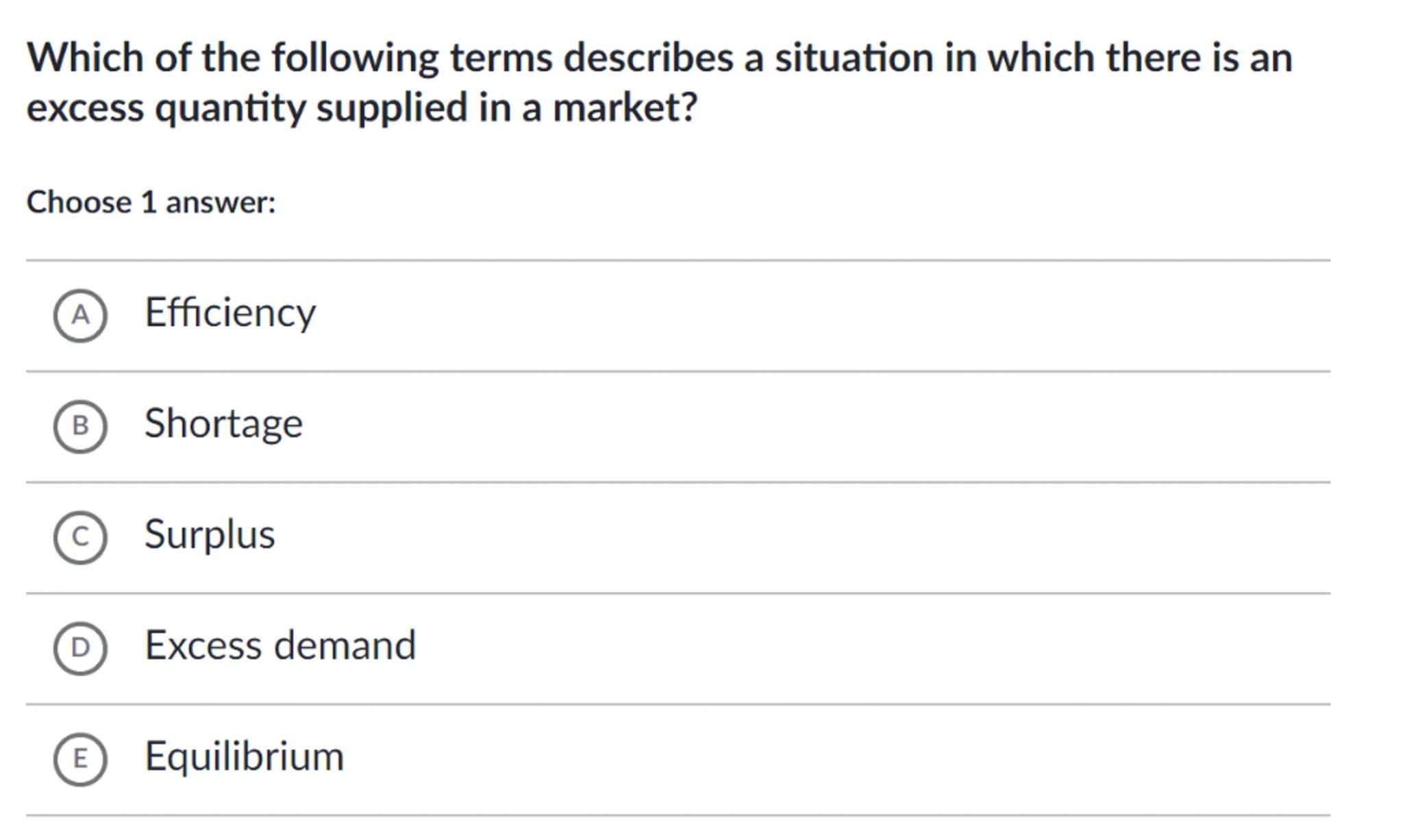 Which of the following terms describes a situation in which there is an excess quantity supplied in a market?