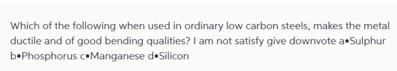 Which of the following when used in ordinary low carbon steels, makes the metal ductile and of good bending qualities? I am not satisfy give downvote a Sulphur bPhosphorus cManganese dSilicon