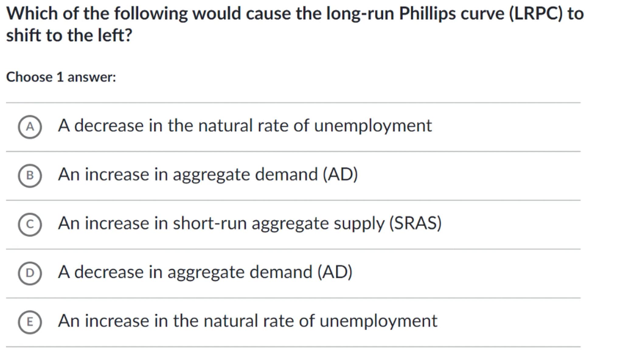 Which of the following would cause the long-run Phillips curve (LRPC) to shift to the left?