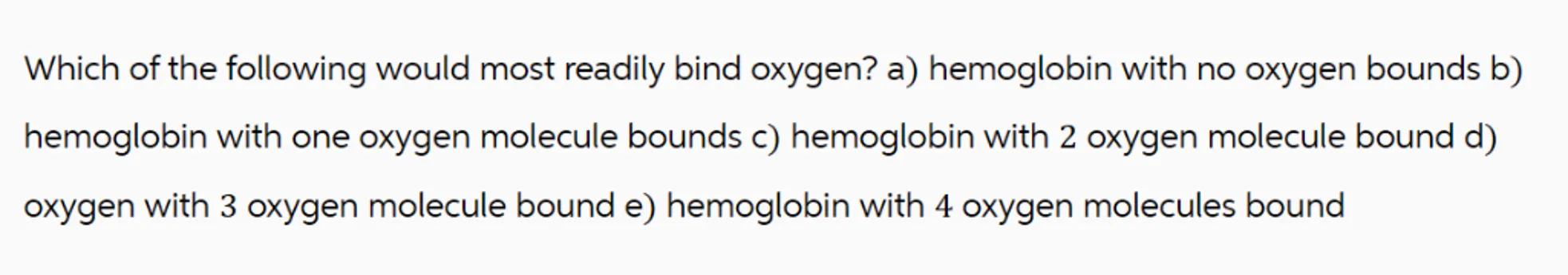 Which of the following would most readily bind oxygen? a) hemoglobin with no oxygen bounds b) hemoglobin with one oxygen molecule bounds c) hemoglobin with 2 oxygen molecule bound d) oxygen with 3 oxygen molecule bound e) hemoglobin with 4 oxygen molecules bound