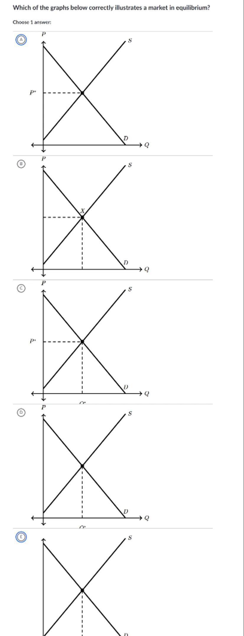 Which of the graphs below correctly illustrates a market in equilibrium?