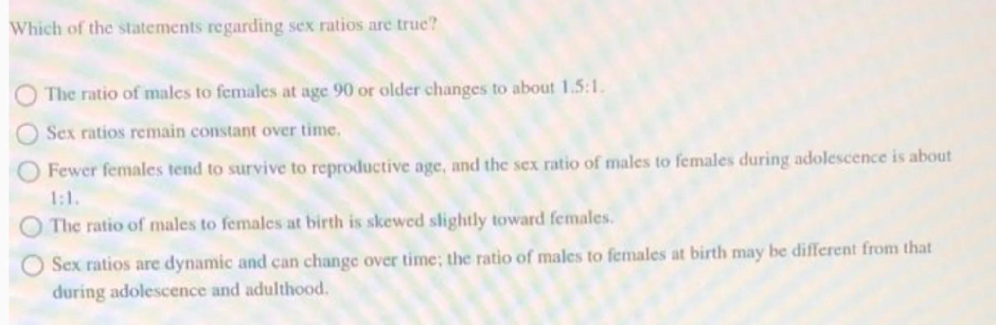 Sex ratios are dynamic and can change over time; the ratio of males to females at birth may be different from that during adolescence and adulthood.