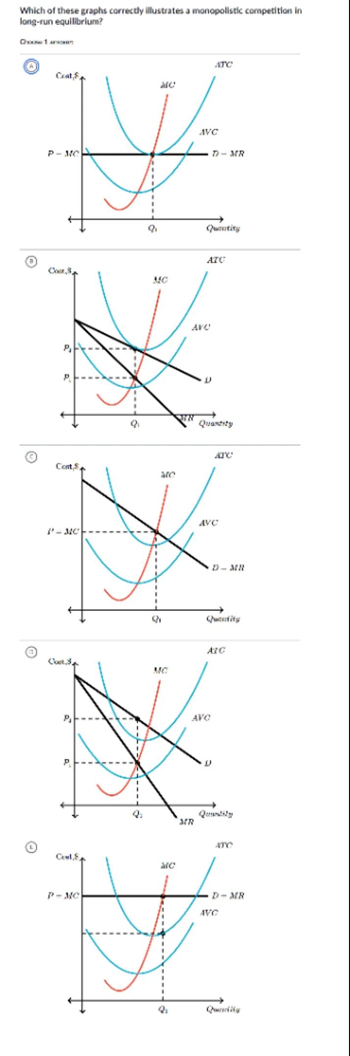 Which of these graphs correctly illustrates a monopolistic competition in long-run equilitbrium?