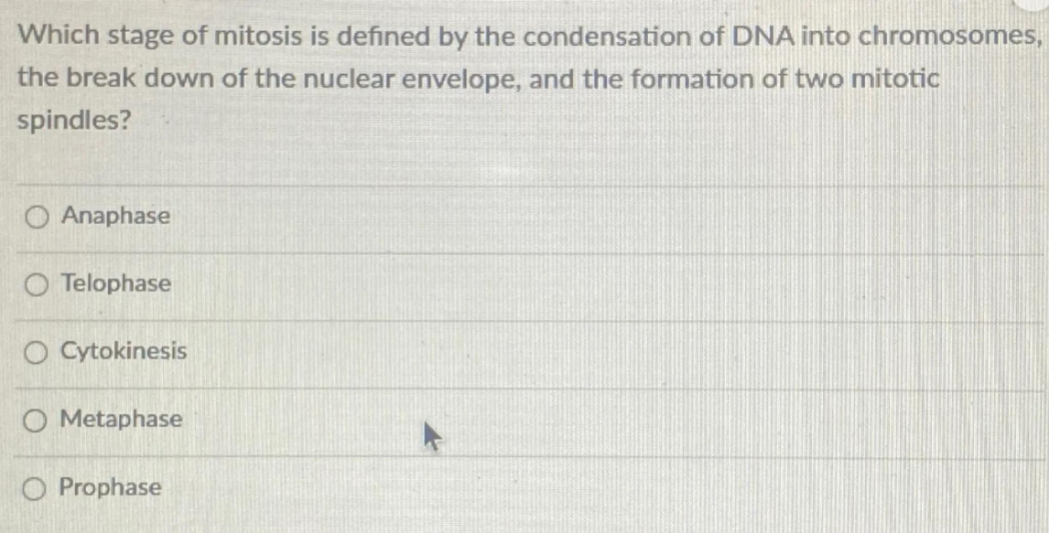 Which stage of mitosis is defined by the condensation of DNA into chromosomes, the break down of the nuclear envelope, and the formation of two mitotic spindles?