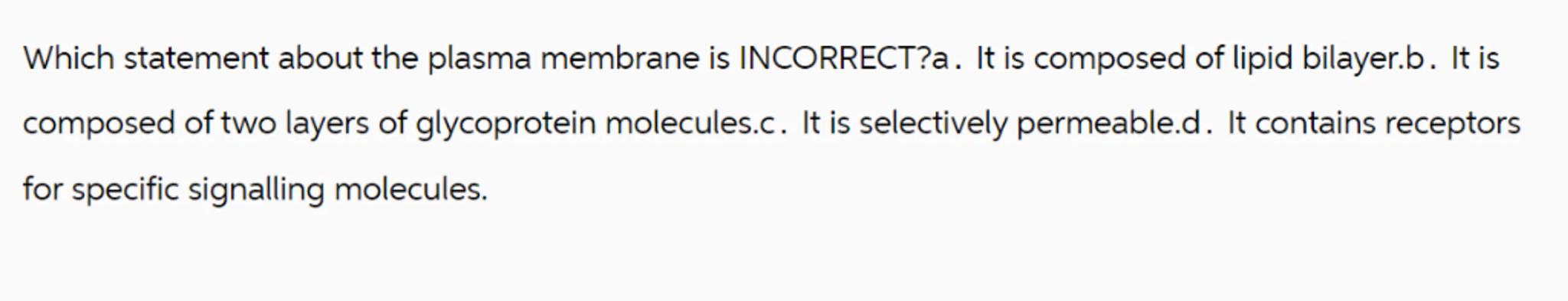 Which statement about the plasma membrane is INCORRECT?a. It is composed of lipid bilayer.b. It is composed of two layers of glycoprotein molecules.c. It is selectively permeable.d. It contains receptors for specific signalling molecules.
