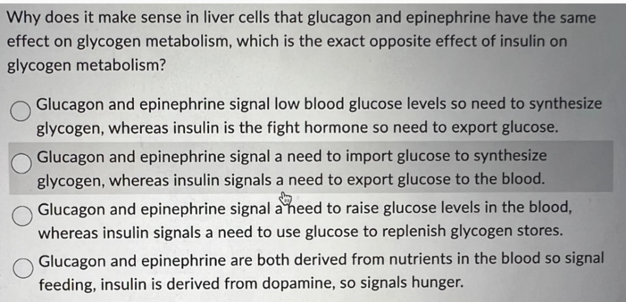 Why does it make sense in liver cells that glucagon and epinephrine have the same effect on glycogen metabolism, which is the exact opposite effect of insulin on glycogen metabolism?
