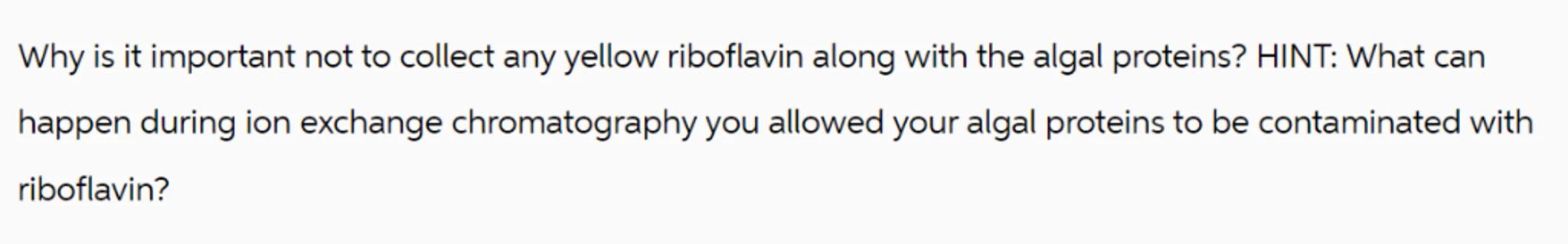Why is it important not to collect any yellow riboflavin along with the algal proteins? HINT: What can happen during ion exchange chromatography you allowed your algal proteins to be contaminated with riboflavin?