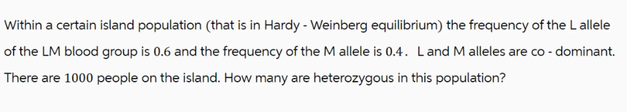 Within a certain island population (that is in Hardy - Weinberg equilibrium) the frequency of the allele of the blood group is 0.6 and the frequency of the allele is 0.4 . and alleles are co - dominant. There are 1000 people on the island. How many are heterozygous in this population?