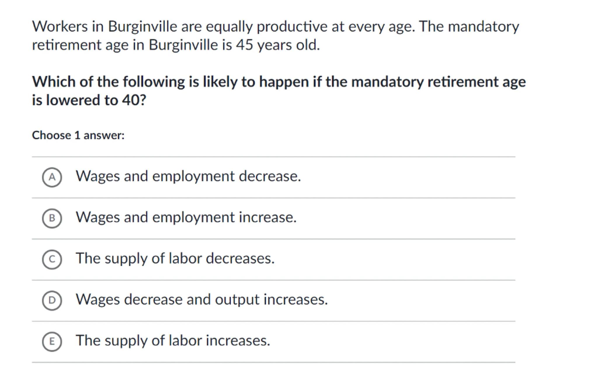 Workers in Burginville are equally productive at every age. The mandatory retirement age in Burginville is 45 years old.