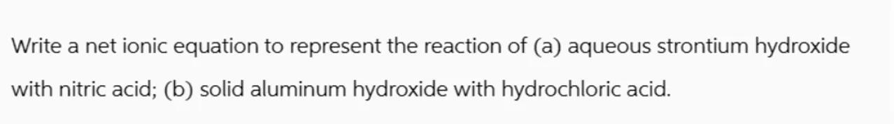 Write a net ionic equation to represent the reaction of (a) aqueous strontium hydroxide with nitric acid; (b) solid aluminum hydroxide with hydrochloric acid.