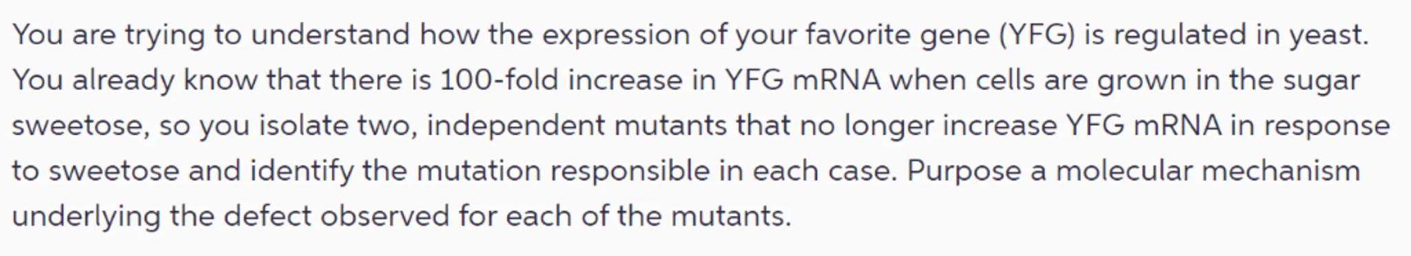 You are trying to understand how the expression of your favorite gene (YFG) is regulated in yeast. You already know that there is 100 -fold increase in YFG mRNA when cells are grown in the sugar sweetose, so you isolate two, independent mutants that no longer increase YFG mRNA in response to sweetose and identify the mutation responsible in each case. Purpose a molecular mechanism underlying the defect observed for each of the mutants.