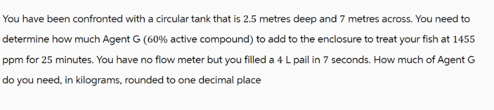 You have been confronted with a circular tank that is 2.5 metres deep and 7 metres across. You need to determine how much Agent G ( active compound) to add to the enclosure to treat your fish at 1455 ppm for 25 minutes. You have no flow meter but you filled a pail in 7 seconds. How much of Agent do you need, in kilograms, rounded to one decimal place