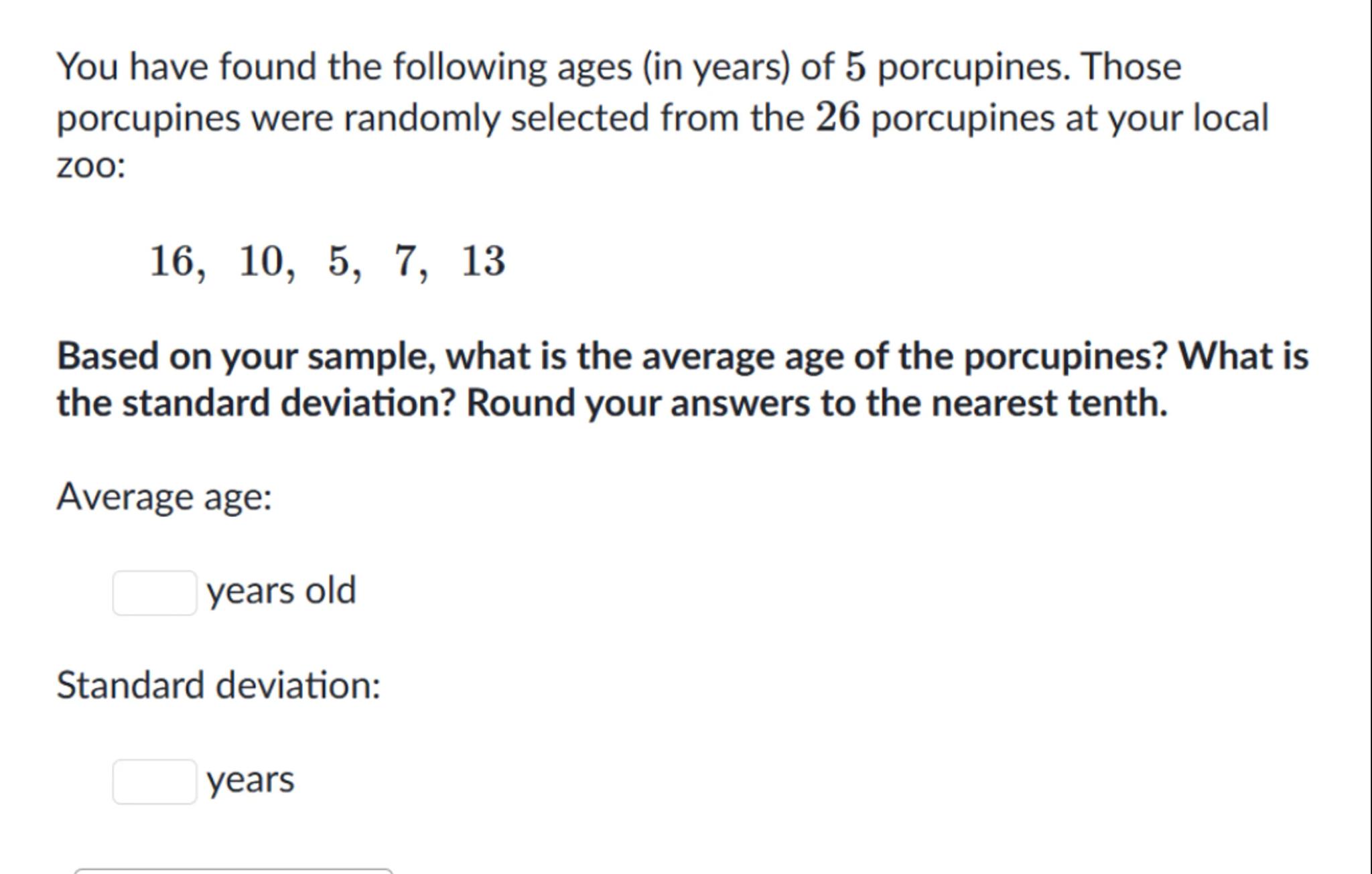 You have found the following ages (in years) of 5 porcupines. Those porcupines were randomly selected from the 26 porcupines at your local zoo:
