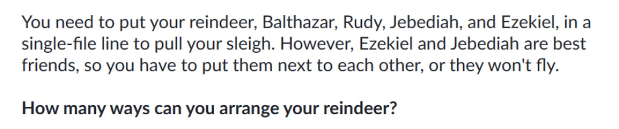 You need to put your reindeer, Balthazar, Rudy, Jebediah, and Ezekiel, in a single-file line to pull your sleigh. However, Ezekiel and Jebediah are best friends, so you have to put them next to each other, or they won't fly.