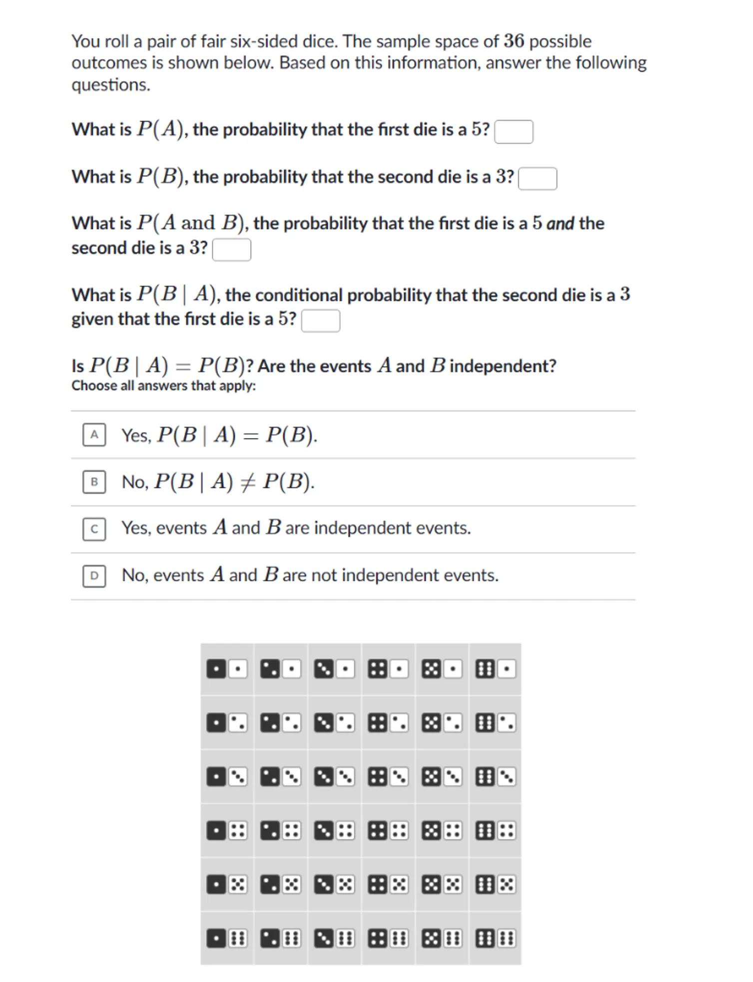 You roll a pair of fair six-sided dice. The sample space of 36 possible outcomes is shown below. Based on this information, answer the following questions.