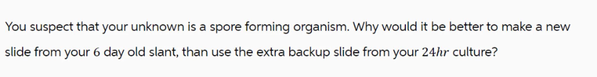 You suspect that your unknown is a spore forming organism. Why would it be better to make a new slide from your 6 day old slant, than use the extra backup slide from your culture?